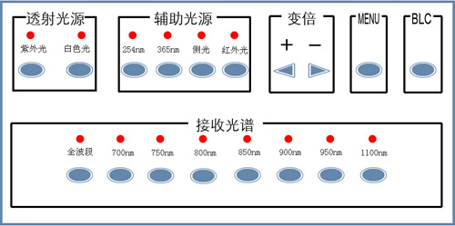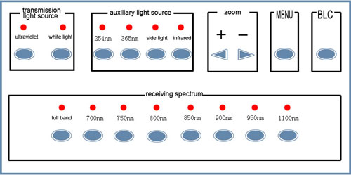 當要顯示票證上熒光暗記、圖案時,按動激發多波段光源按鈕,選擇合適波段的光源,這樣可獲得紫外熒光效果。